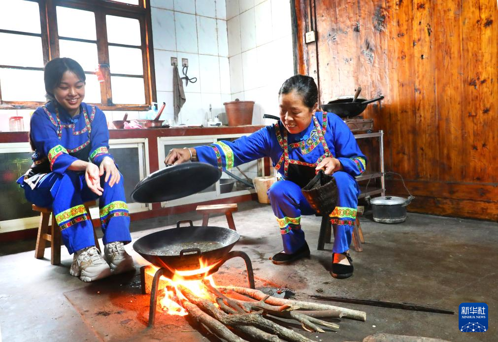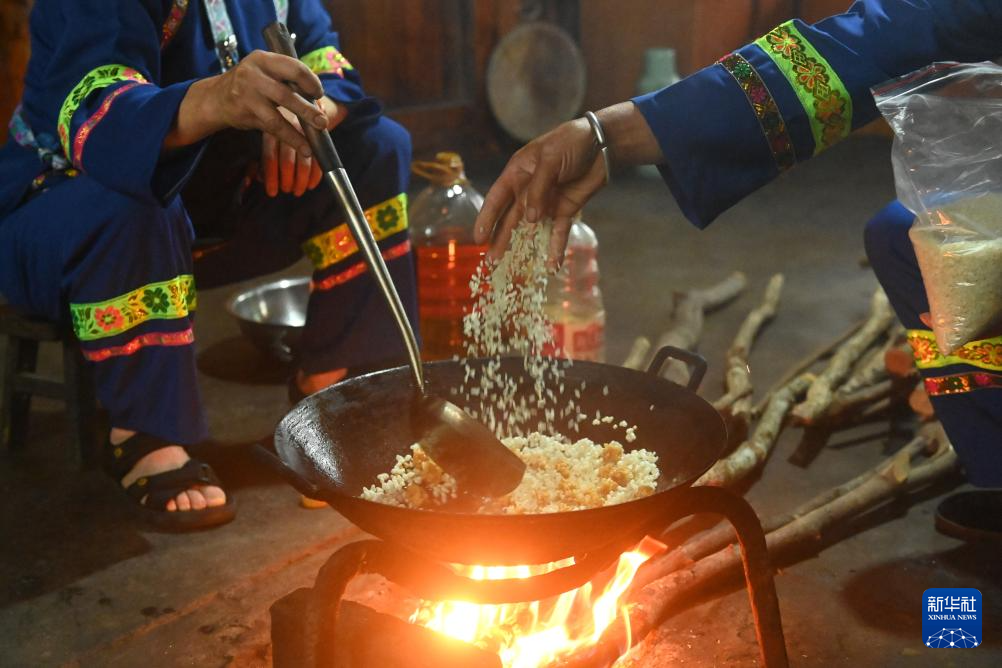 在广西龙胜各族自治县伟江乡布弄村,村民蒙己秀(左)和蒙银花在炒米花准备打油茶(6月26日摄)。