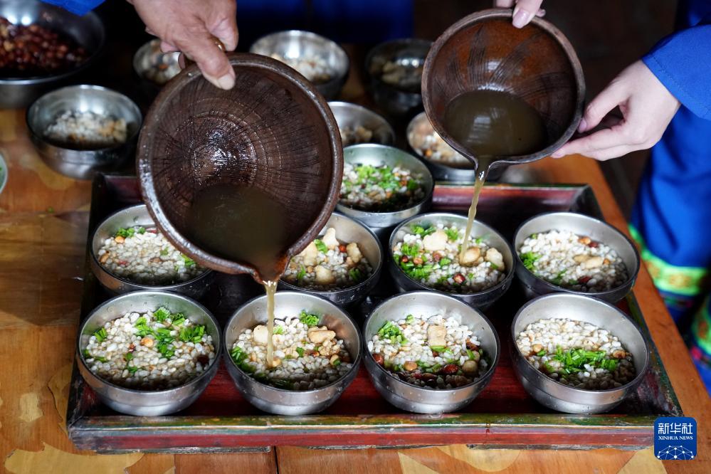广西龙胜各族自治县伟江乡布弄村,村民为客人准备油茶(6月26日摄)。
