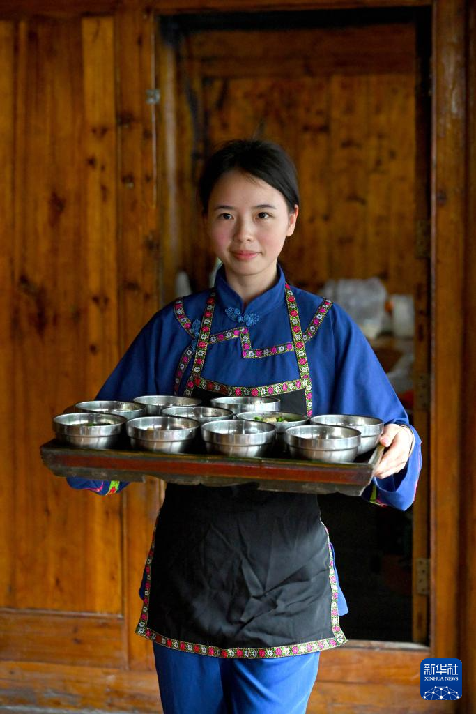 在广西龙胜各族自治县伟江乡布弄村,一名女子为客人端上煮好的油茶(6月26日摄)。