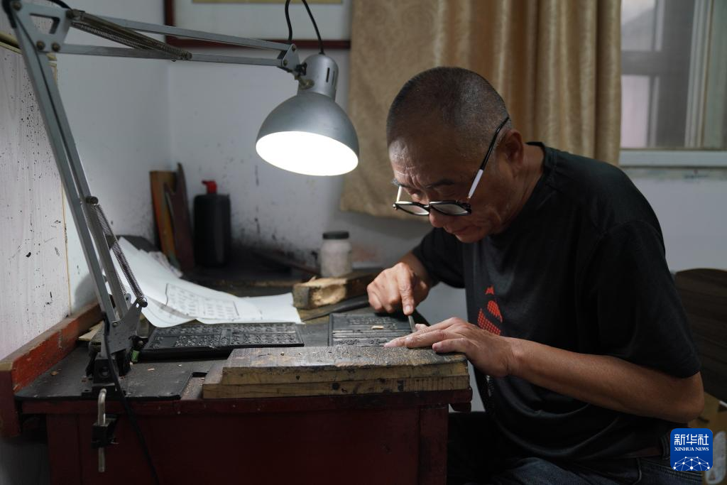 6月27日,在金陵刻经处技艺展示区,非遗传承人王康在刻版。