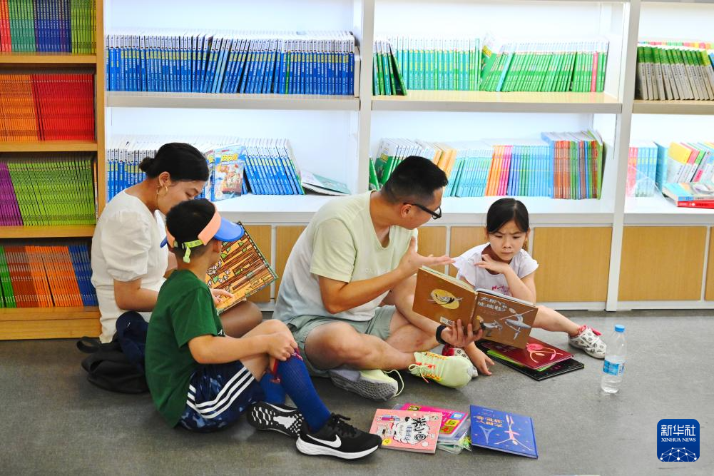 7月6日,福州新华书店鳌峰坊书城内家长陪伴孩子读书纳凉。