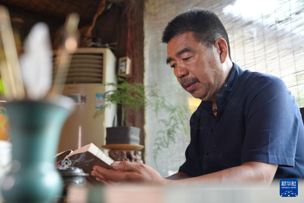 张书芳在阅读香谱,查阅制香古方(7月9日摄)。