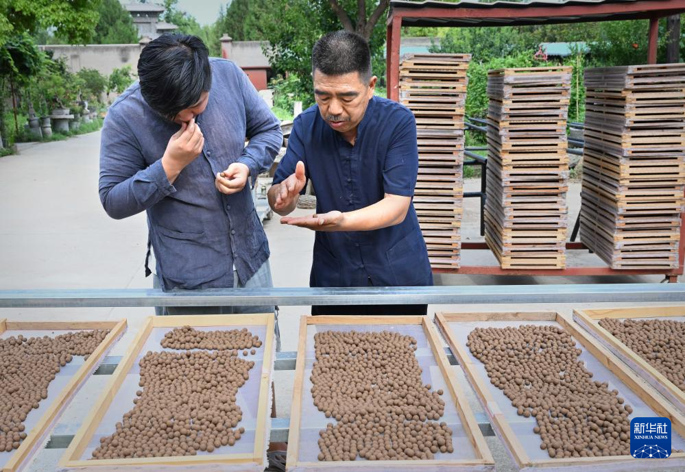 张书芳(右)向儿子张力讲解如何分辨香珠晾晒是否达到标准(7月3日摄)。