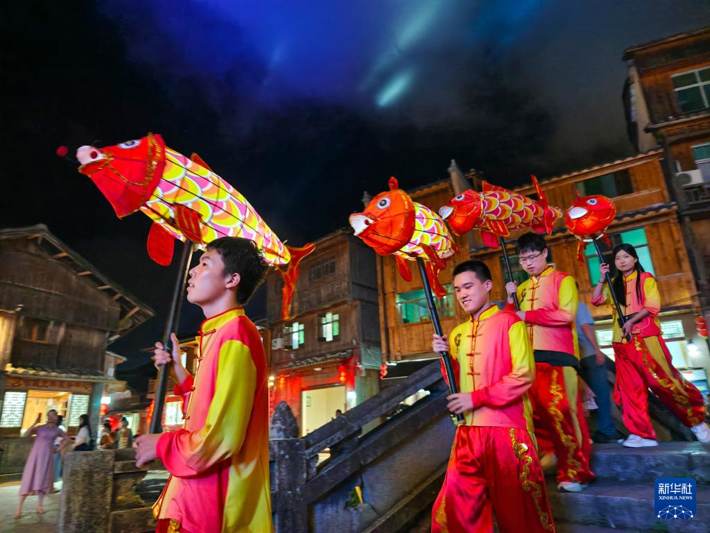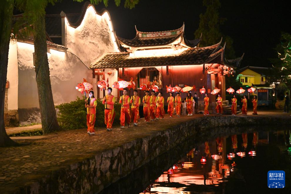 浦源村鲤鱼溪景区内进行的鲤鱼灯习俗表演(7月29日摄)。
