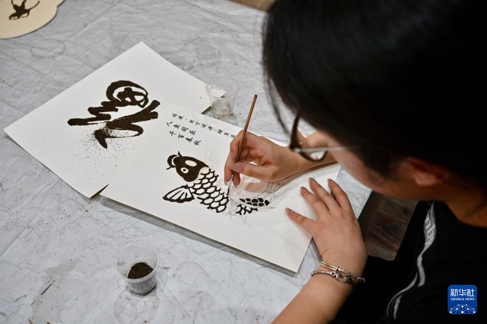 7月14日,浦源村鲤鱼溪画院内一位女孩在描绘鲤鱼画作。