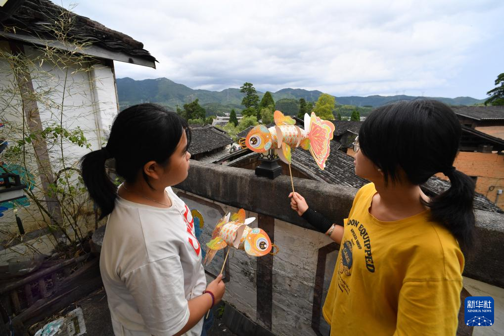 7月14日,浦源村鲤鱼溪画院内两位在此研学的大学生展示手工制作的鲤鱼灯。