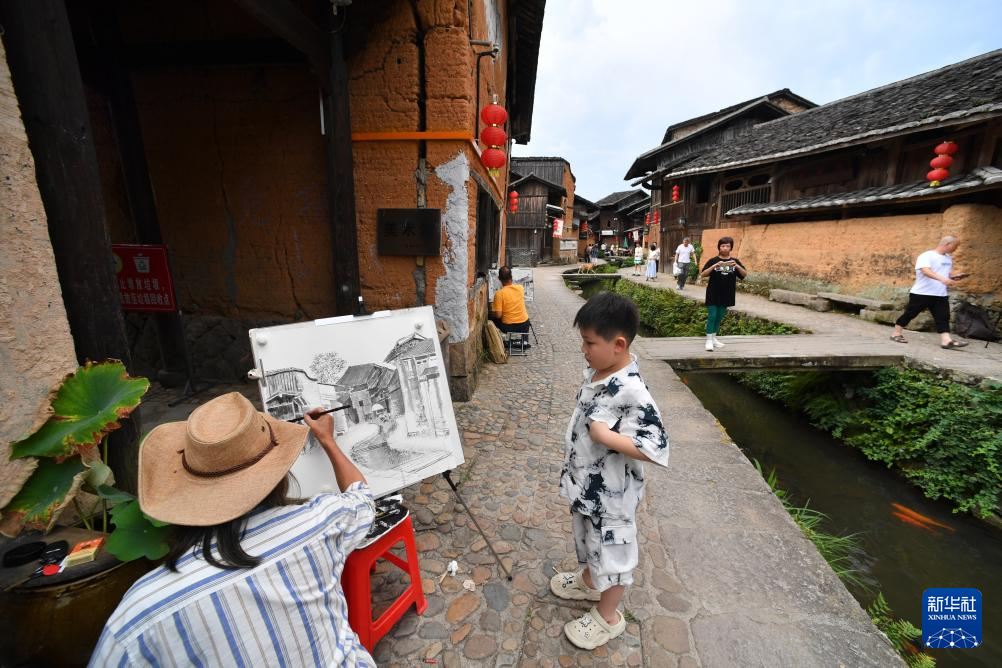 7月14日,浦源村鲤鱼溪景区内一位男孩在欣赏画家写生。