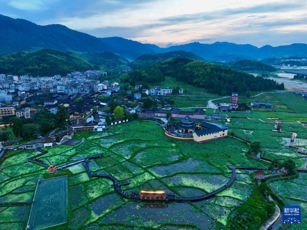 这是7月12日拍摄的浦源村百亩荷花塘及村内古建筑群(无人机照片)。