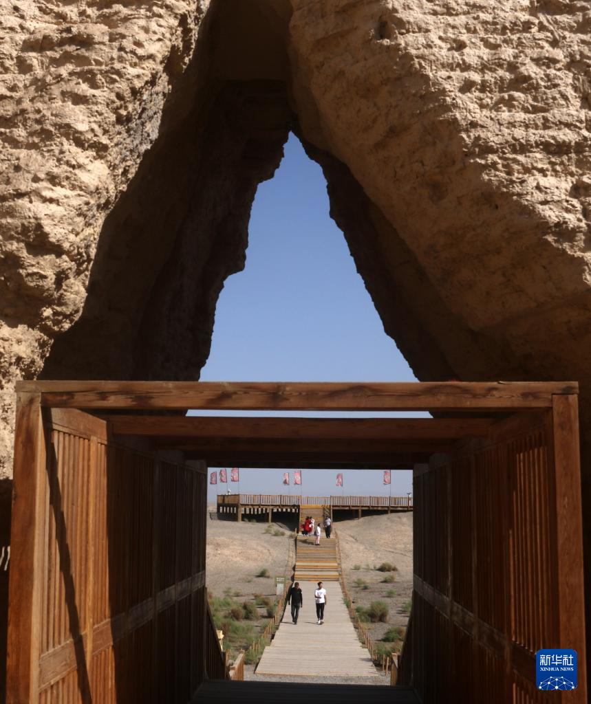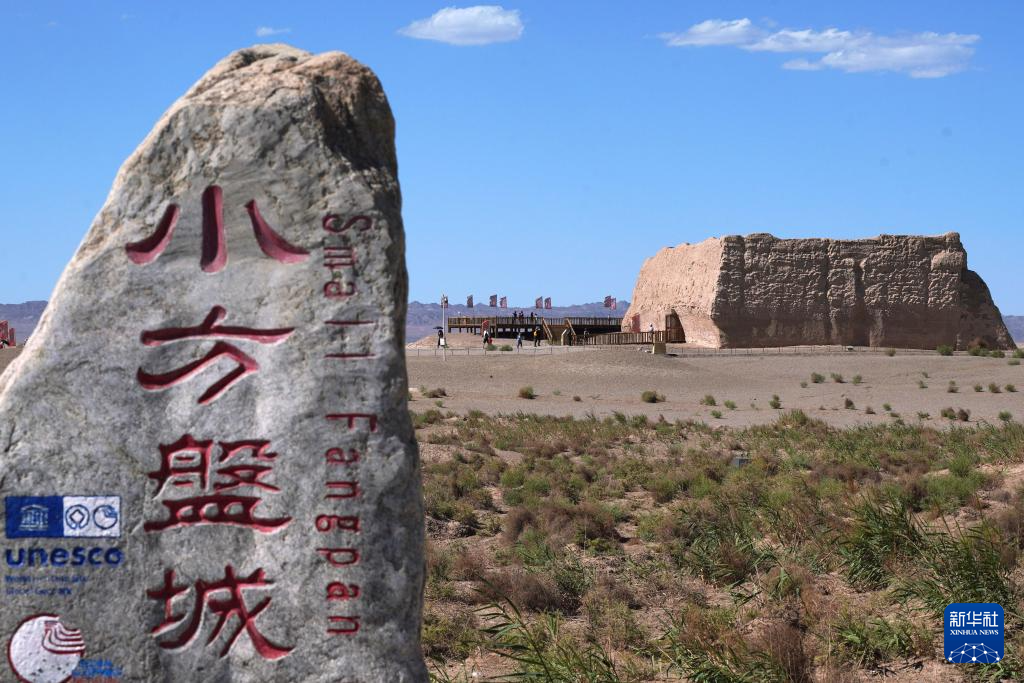 8月25日,游客在甘肃省敦煌市玉门关遗址区参观小方盘城。