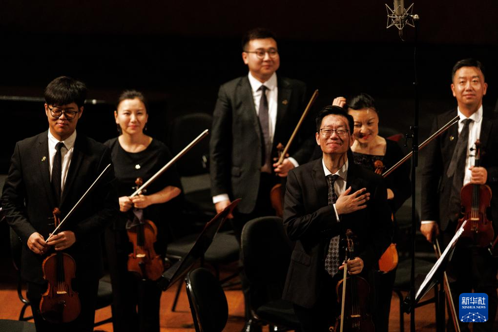 9月9日,在巴西里约热内卢市立剧院,中国交响乐团首席小提琴手姚亮(前右)在演出结束后向观众致意。