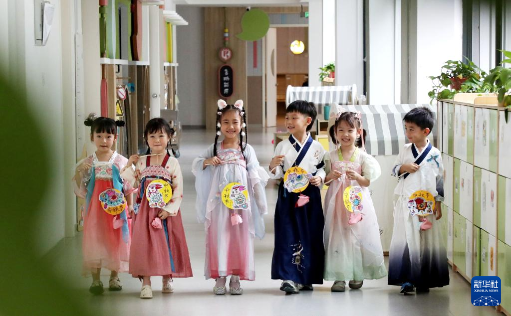 9月12日,浙江省台州市仙居县迎晖幼儿园小朋友在老师的指导下学做手工月饼。