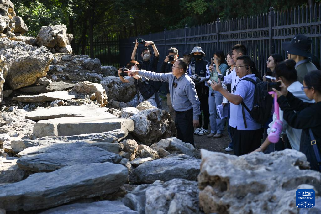 9月22日,北京市考古研究院工作人员向活动参与者介绍文源阁遗址中的蹬道遗迹。