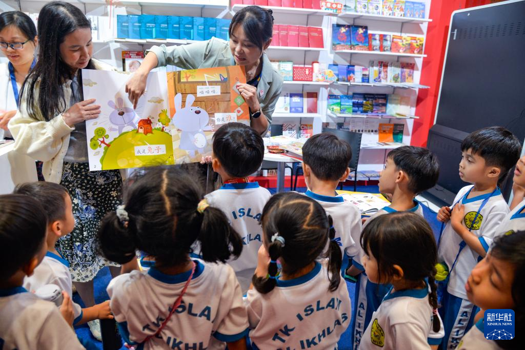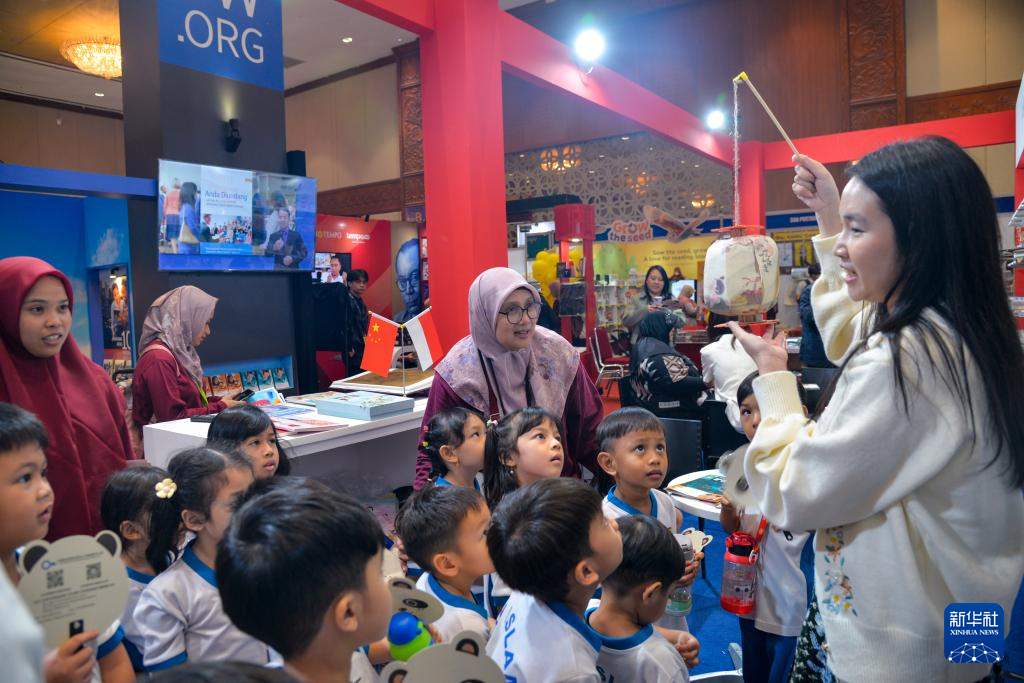 9月25日,在印度尼西亚雅加达会展中心,小朋友参观印尼国际书展中国出版代表团展台。