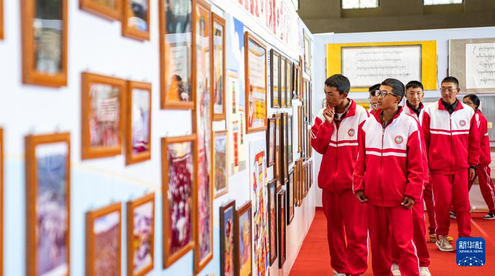 学生在西藏首届中小学生艺术展演活动获奖作品展厅内参观(9月25日摄)。