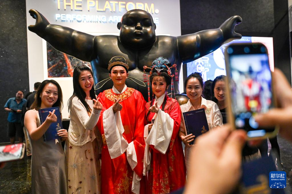 10月18日,在马来西亚吉隆坡,观众与锡剧《追香记》的演员们合影。