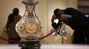 10月29日,观众在太原北齐壁画博物馆选购文创产品。