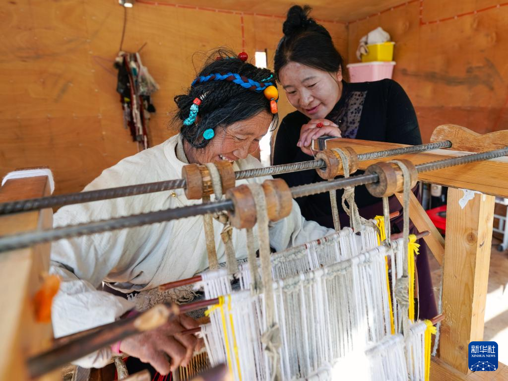 占珠(前)在娜叶编织工坊使用老式织机制作氆氇(11月3日摄)。在四川省甘孜藏族自治州德格县麦宿镇,娜叶家族中的女性以精湛的编织技艺著称。她们利用牦牛绒、羊绒等物编织出优质的氆氇等纺织品,深受当地居民喜爱。占珠于1960年出生于麦宿,是娜叶家族编织工艺的继承者和发扬者,是非遗项目“藏族牛羊毛编织技艺”四川省甘孜州代表性传承人。在女儿扎西曲措的帮助下,娜叶编织工坊的产品日益丰富,在传承家族古老技艺的同时,带动周边乡亲共同致富。