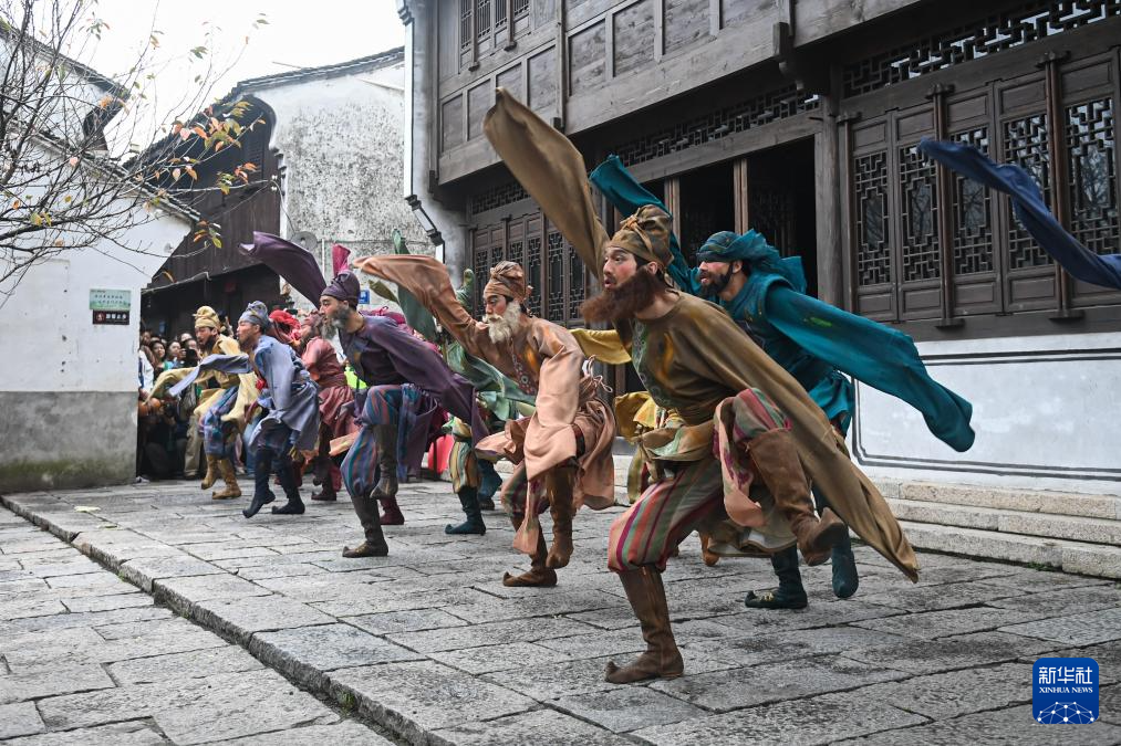 11月16日,浙江音乐学院演员在新市古镇表演《十八焕蝶》民间舞。