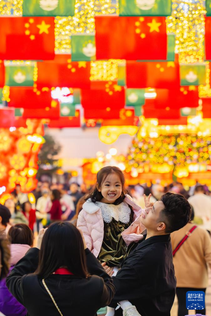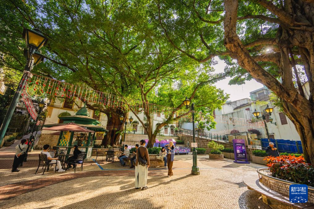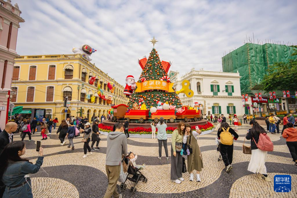 12月12日,游客在澳门议事亭前地的圣诞树前拍照。