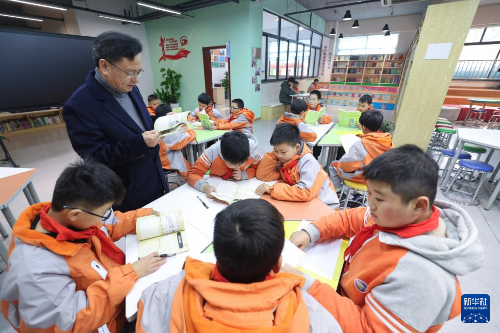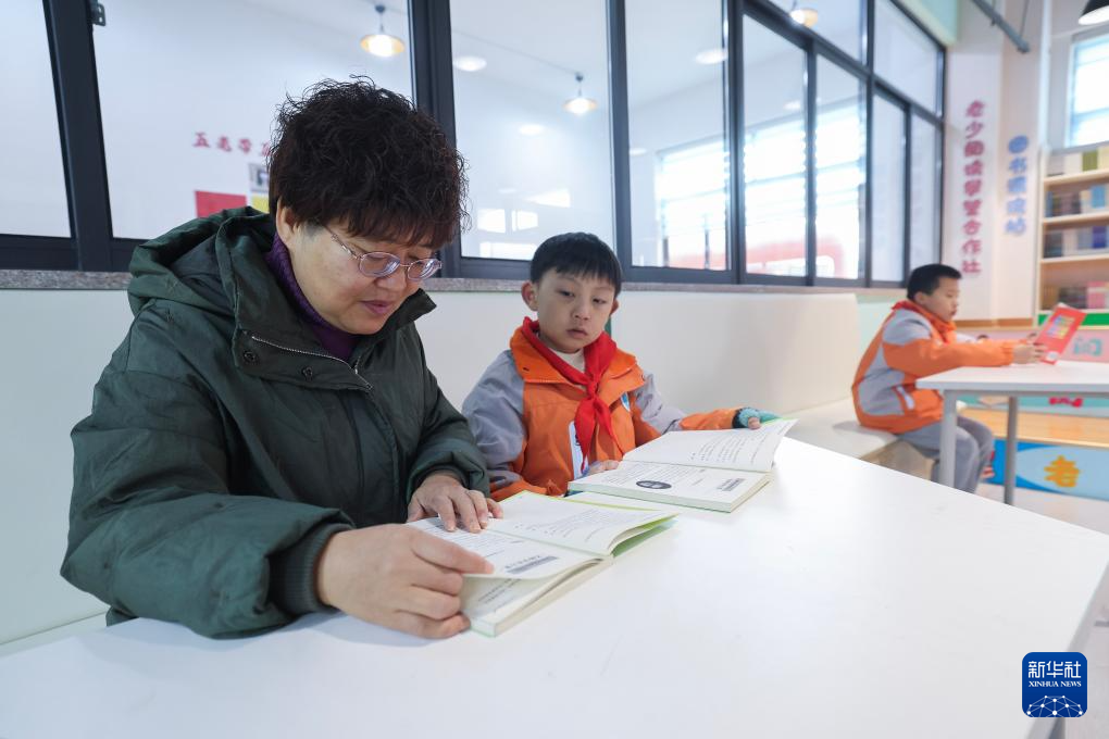 12月18日,在嘉兴市南湖区余新镇中心小学图书馆的“老少阅读攀登合作社图书漂流站”,退休教师陶坤华与孩子们一起阅读。