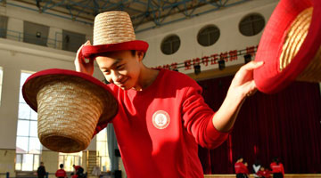 12月19日,在日本东京都的中央大学,一名大学生展示自己制作的木版水印画。