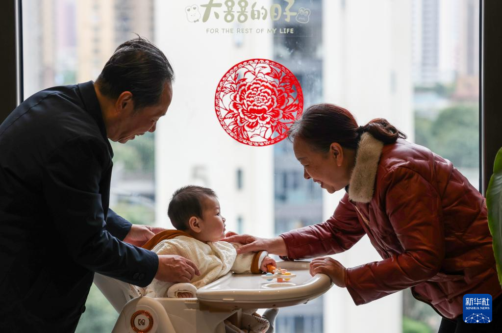 宁德市民刘慧凌(右)和老伴一起与外孙女互动,窗户上贴的是柘荣剪纸(2024年12月13日摄)。