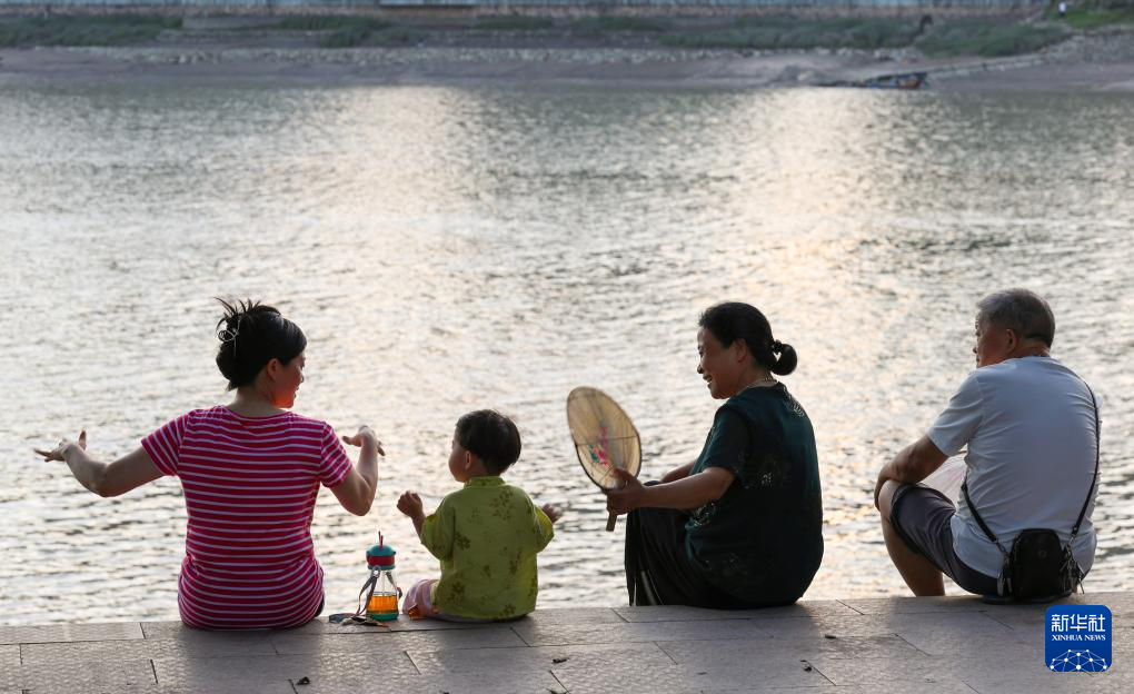 在宁德福安市,老年人手持官埔油扇坐在江边纳凉(2024年7月6日摄)。