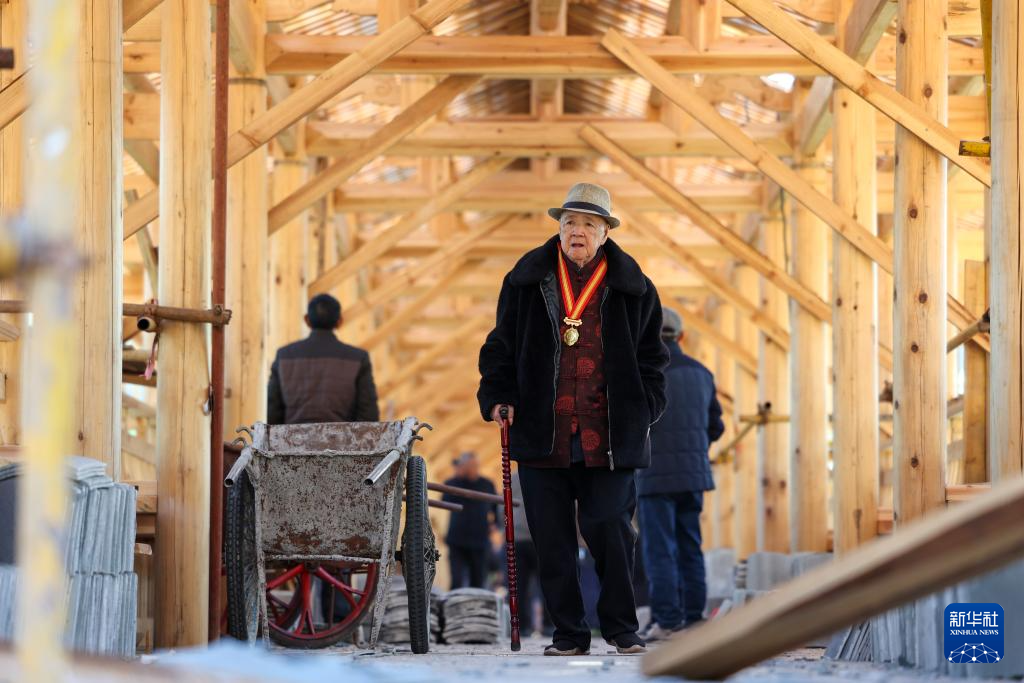 在宁德市屏南县长桥镇,“木拱桥传统营造技艺”国家级代表性传承人黄春财在万安桥上查看修复工程进展(2023年11月29日摄)。万安桥保护修复工程由当地廊桥建造世家、木拱桥传统营造技艺传承人黄春财、黄闽辉父子主持。