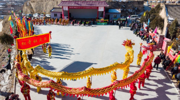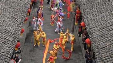 1月7日,人们在阆中古城观看舞龙舞狮。
