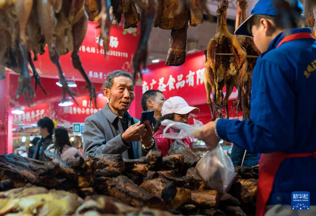1月14日,顾客在昆明滇池国际会展中心购买肉类腌制品。