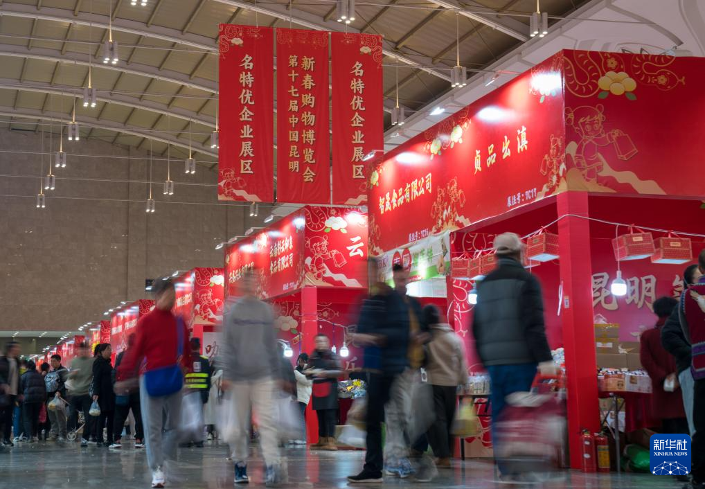 近日,第十七届中国昆明新春购物博览会暨云南省2025年彩云迎新消费季在昆明滇池国际会展中心开幕,展区内年货琳琅满目,前来购买年货的市民络绎不绝,整个会场洋溢着浓浓的节日氛围。