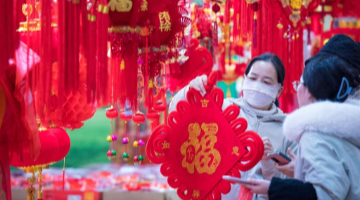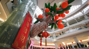 1月15日,在重庆市梁平区一商场,商场工作人员在摆放带有梁平木版年画元素的新春装饰。