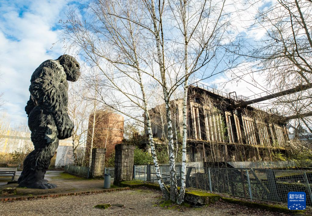 这是德国萨尔州的弗尔克林根钢铁厂遗址的工业设施和博物馆户外区域的的艺术作品(2024年12月18日摄)。