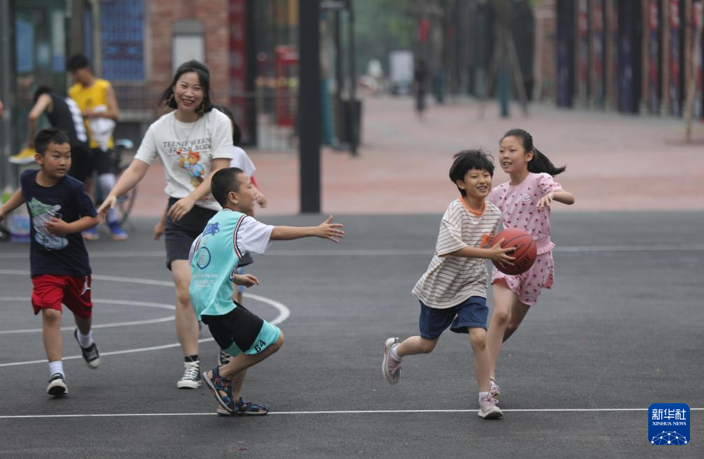 小朋友们在辽宁省沈阳市红梅文创园的篮球场打篮球(2021年7月7日摄)。