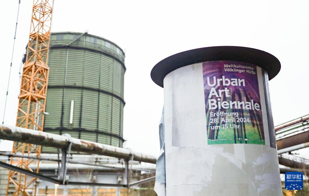 这是在德国萨尔州的弗尔克林根钢铁厂遗址拍摄的“城市艺术双年展”海报(2024年12月17日摄)。