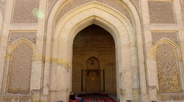 1月19日,小朋友在社区庙会上和舞狮互动。