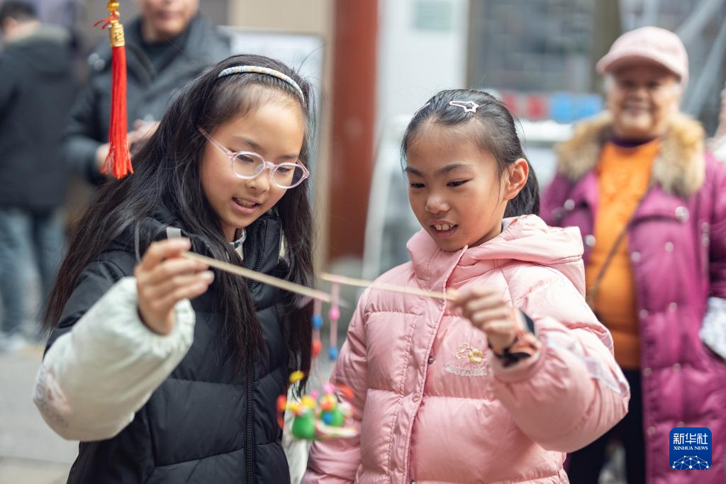 1月21日,小朋友在重庆市巴南区西流沱小镇把玩非遗面塑作品。