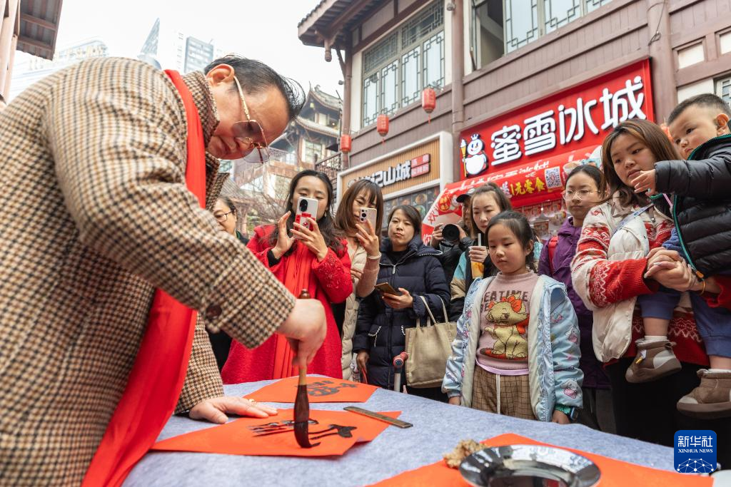 1月21日,在重庆市巴南区西流沱小镇,书法爱好者为游客写福字。