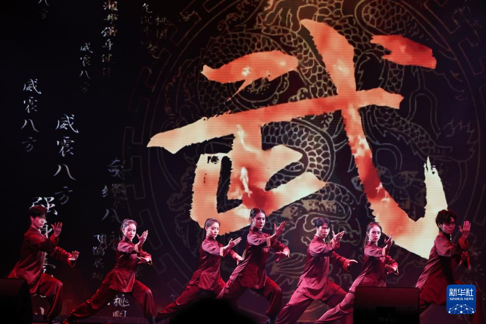 1月20日,首都体育学院艺术团的演员在法国巴黎举行的“金蛇献瑞”巴黎春节联欢晚会上表演《武韵》。