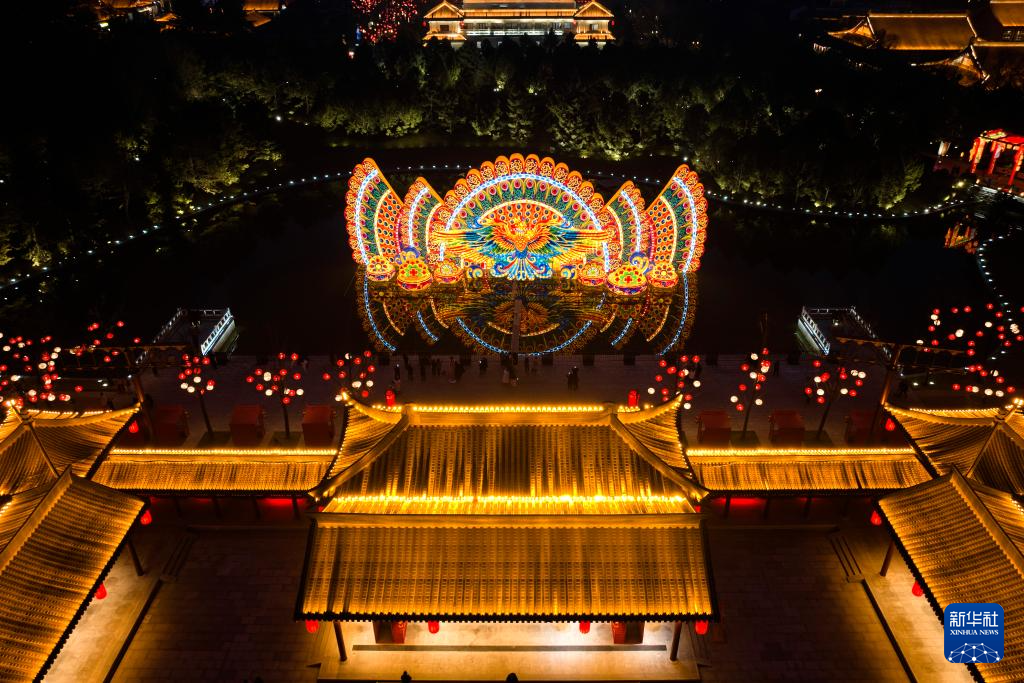 1月22日晚拍摄的西安大唐芙蓉园内的巨型彩灯(无人机照片)。