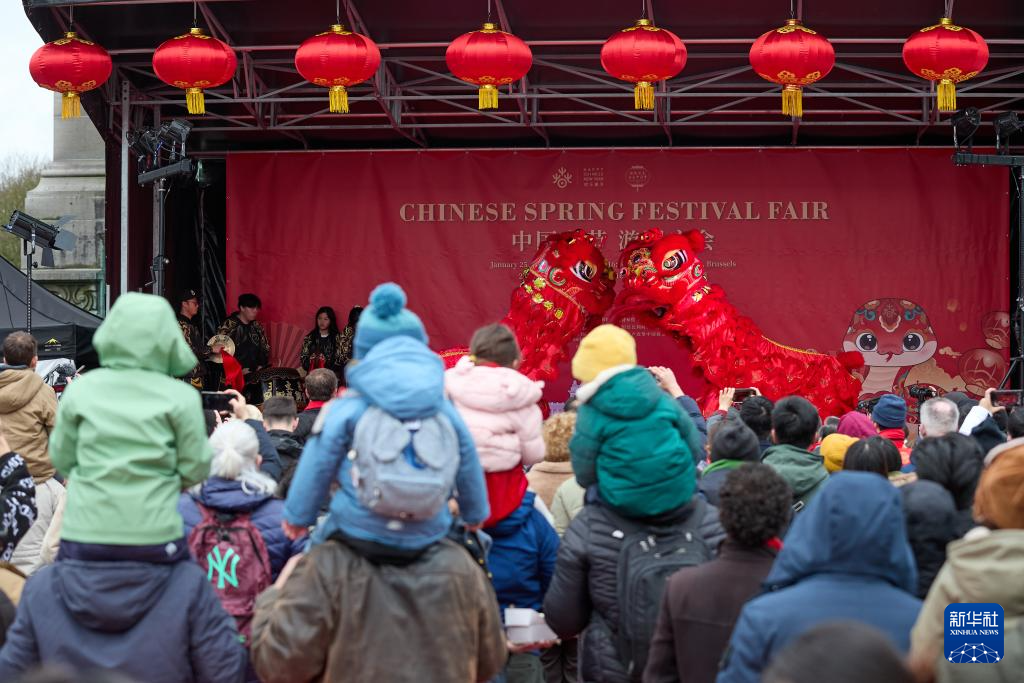 1月25日,观众在比利时首都布鲁塞尔举行的“中国春节游园庙会”活动上观看舞狮。