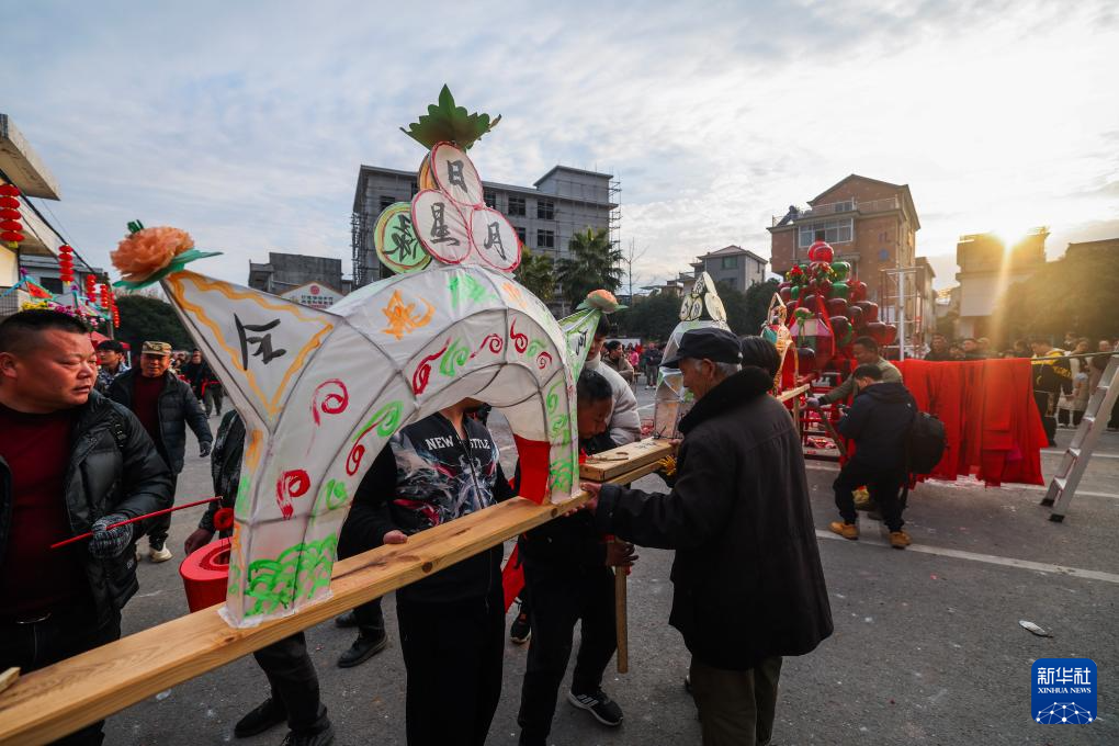 2月10日,赤松镇虎岩村村民将板凳龙连接起来,准备进行晚上的巡游。