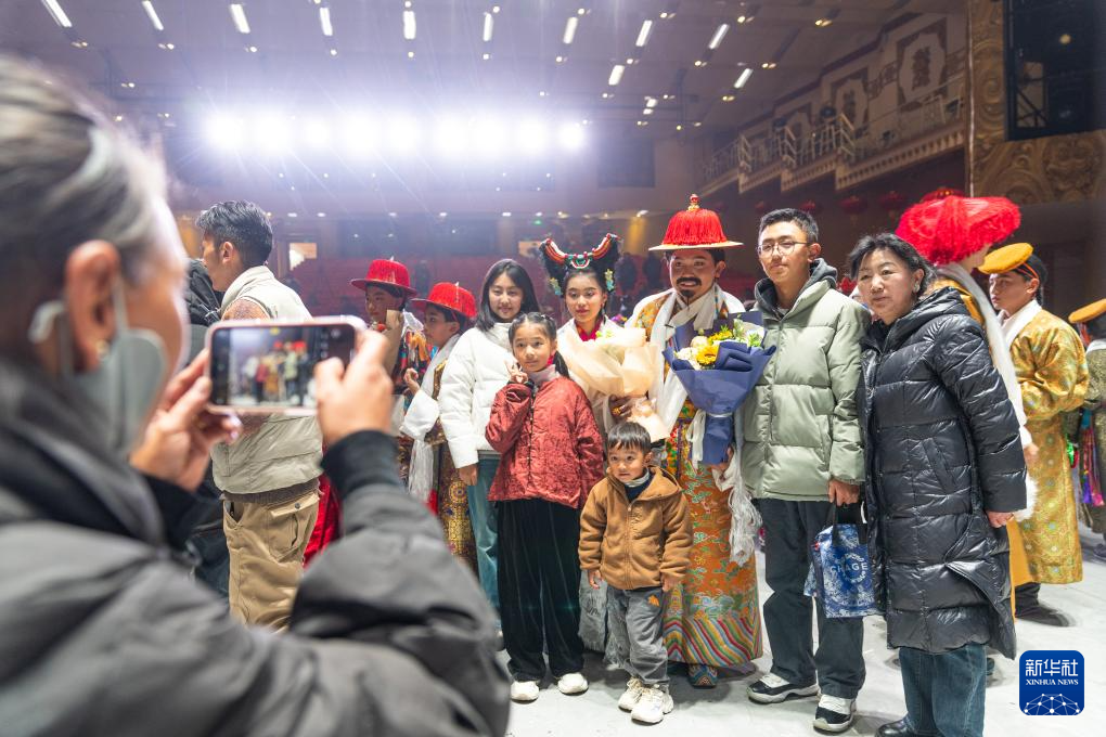 演出结束后小演员们与家人合影留念(2月11日摄)。