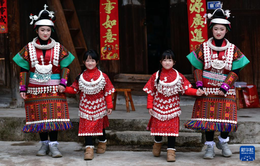 在贵州省凯里市舟溪镇舟溪村茶林苗寨,长辈在帮助双胞胎姐妹杨柠羽(左一)、杨柠竹(左三)穿戴苗族盛装(2月15日摄)。