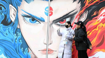 2月20日,市民在杭州街头观看哪吒主题墙绘。