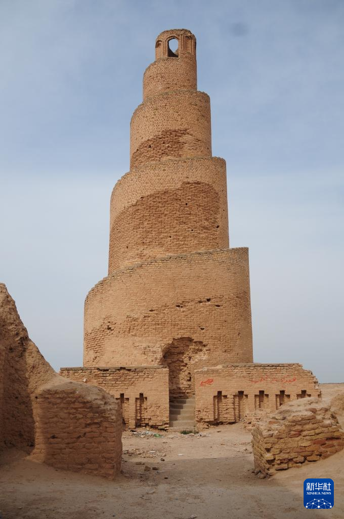 这是3月3日在伊拉克萨拉赫丁省拍摄的萨迈拉大清真寺的螺旋宣礼塔。