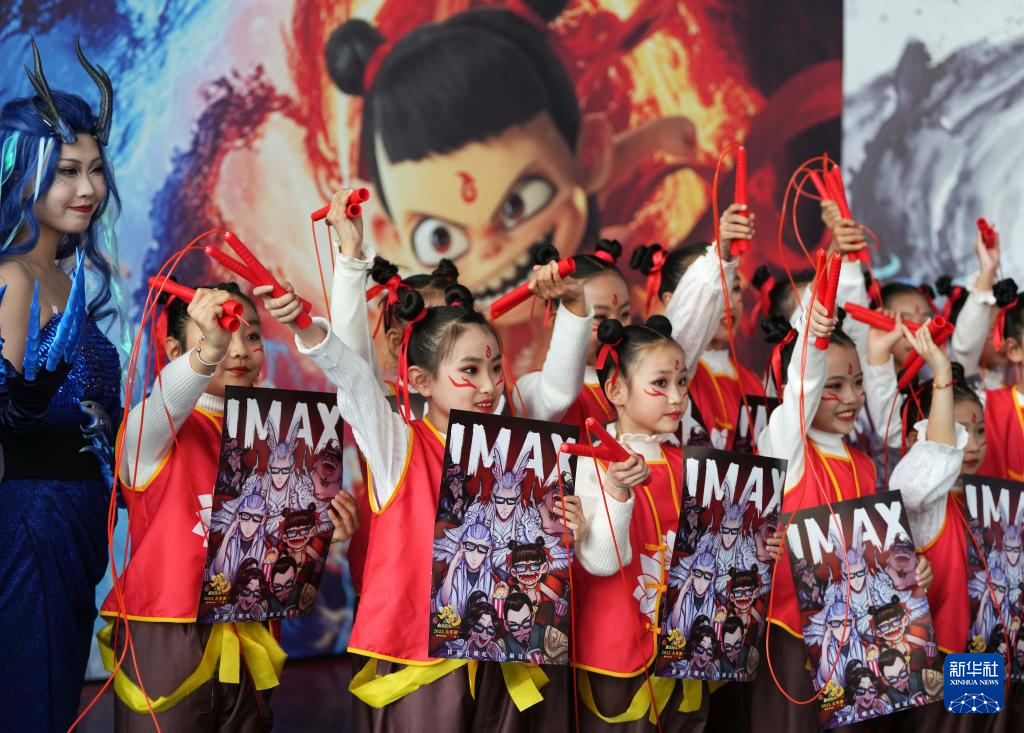 在沈阳的辽宁省科技馆万达影城IMAX GT激光影厅前,参加表演的小朋友举着海报加油助力(3月14日摄)。