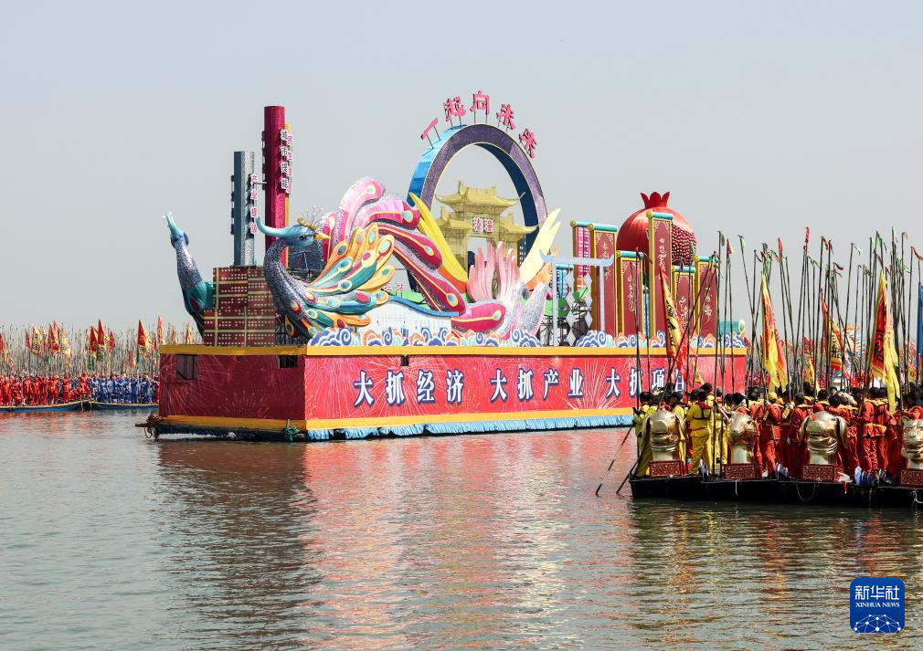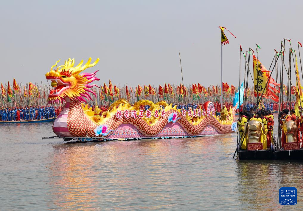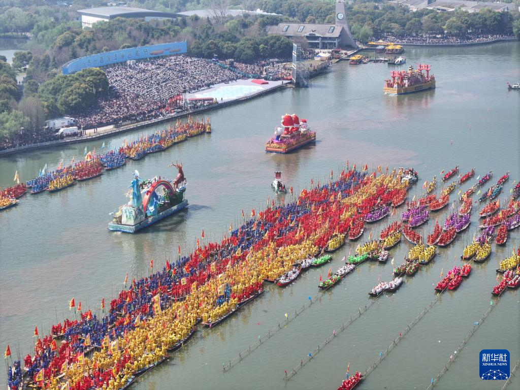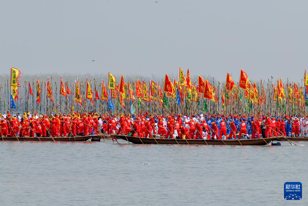 4月6日,龙船行驶在湖面上(无人机照片)。