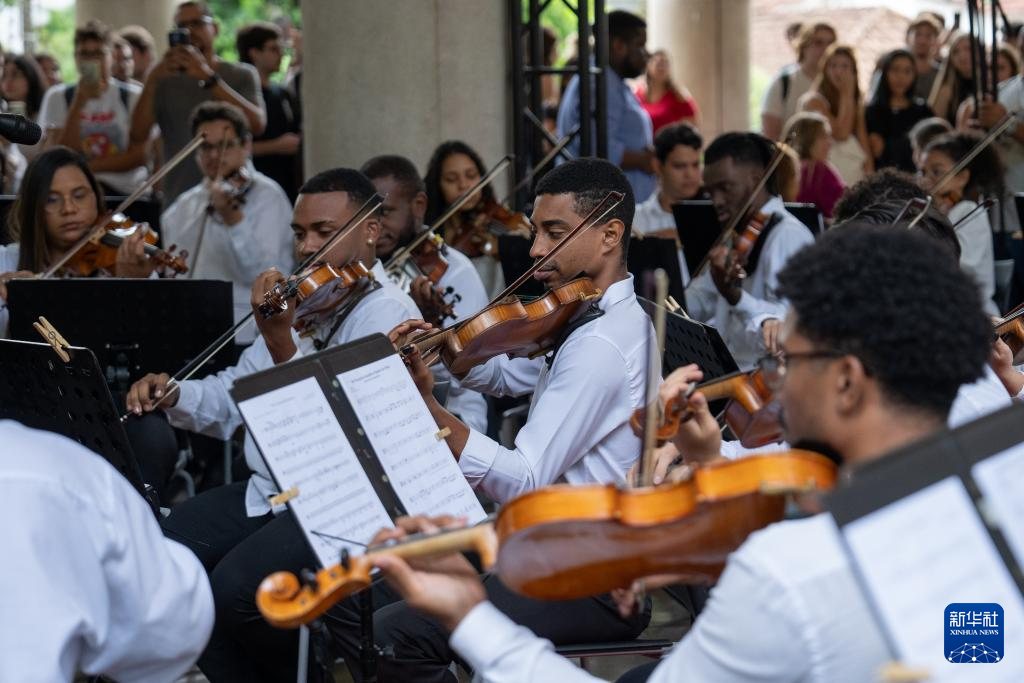 4月15日,在巴西里约热内卢天主教大学举办的“国际中文日”庆祝活动上,里约热内卢青年交响乐团演奏乐曲。