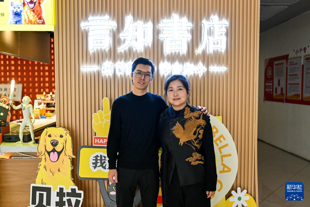 4月22日,在乌兰察布市集宁区言知书店,巩懋林(左)与妻子蒲欣合影。